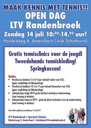 Naast het ORKT vindt er op 14 juli nog een leuk evenement plaats op Randenbroek, namelijk de Open Dag. Wil jij je broertje/zusje/vriendje/vriendinnetje/buurmeisje etc ook kennis laten maken met tennis? Dan kan dat op de open dag! Nodig ze allemaal uit zodat jullie samen kunnen tennissen en je ze enthousiast kunt maken voor tennis.